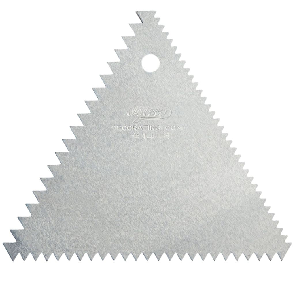 Material de construcción: Acero inoxidable.Color: Plata.Dimensiones: 11 cm de ancho x 9.5 cm de largo.Forma: Triangulo.Todos sus lados están dentados con diferentes tamaños para crear patrones.Dispone de un agujero en la parte superior para colgarlo en paredes o superficies.-Categoría: Utensi. Panad-Pastel