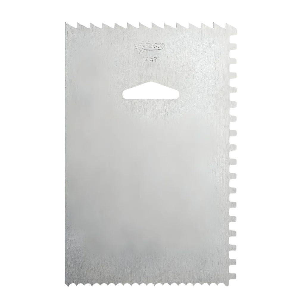 Material de construcción: Acero inoxidable.Color: Plata.Dimensiones: 10 cm de ancho x 15 cm de largo.Forma: Rectángulo.Cuenta con tres lados dentados y un lado liso para crear distintos patrones.Dispone de un agujero en la parte superior para colgarlo en paredes o superficies.-Categoría: Utensi. Panad-Pastel