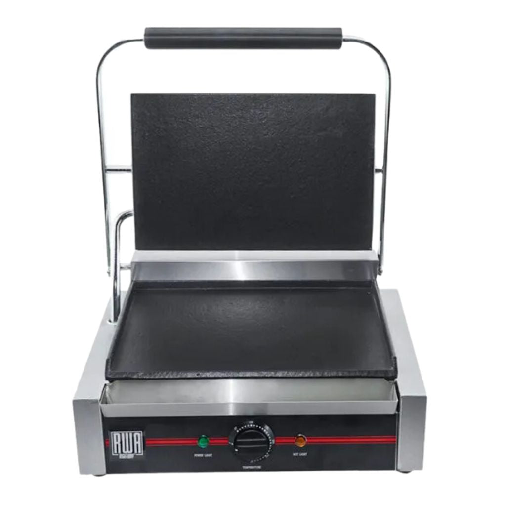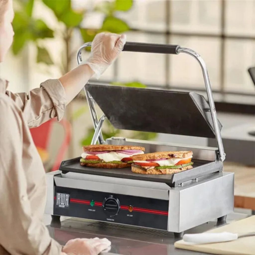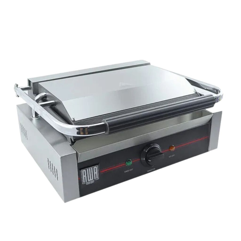 La Sandwichera Plana RWA funciona para calentar y tostar pan relleno de algún ingrediente, esto para obtener un crujiente y dorado en la corteza del pan, al utilizar la Sandwichera Plana RWA le tomará mucho menos tiempo preparar sándwiches a como si los hiciera de forma convencional, además con la Sandwichera Plana RWA puede conseguir este delicioso platillo con un resultado uniforme en el pan. Caliente en esta Sandwichera Plana RWA pan cuadrado o baguette con relleno, para lograr una deliciosa explosión de sabores como la del queso derretido o mantequilla con un dorado y crujiente en el pan exquisito con la Sandwichera Plana RWA. La Sandwichera Plana RWA permite que el sándwich o alimento se caliente por ambos lados ya que viene equipada con dos placas que calientan arriba y abajo, las cual están unidas con bisagras esto para permitir que el sándwich o alimento caliente por ambos lados a la misma vez, estas placas de la Sandwichera Plana RWA son lisas. La Sandwichera Plana RWA es un equipo diseñado con una estructura de acero inoxidable robusta y de calidad profesional con plancha de hierro fundido y revestimiento cerámico para ofrecer mejor resultado en el platillo y es fácil de limpiar.