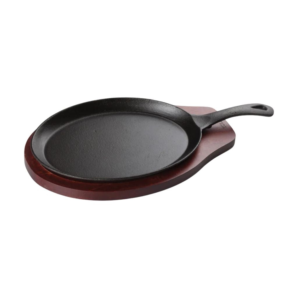 Juego de Sartén de hierro con base de madera.Medidas: 38.7cm de largo x 20.5cm de ancho x 4 cm de altura.Juego (2 piezas) de Sartén con base especial para fajitas de figura ovalada.Material: Sartén de hierro fundido, base de madera.-Categoría: Ollas y sartenes.