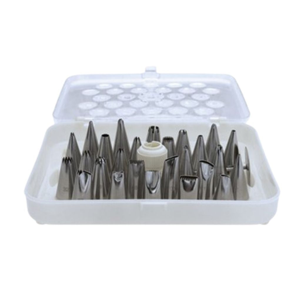 Juego de 26 piezas de boquillas para decorar.Incluye caja para almacenaje, un acoplador estandar y un clavo metalico para flores.Material: Boquillas de acero inoxidable. -Categoría: Utensi. Panad-Pastel.