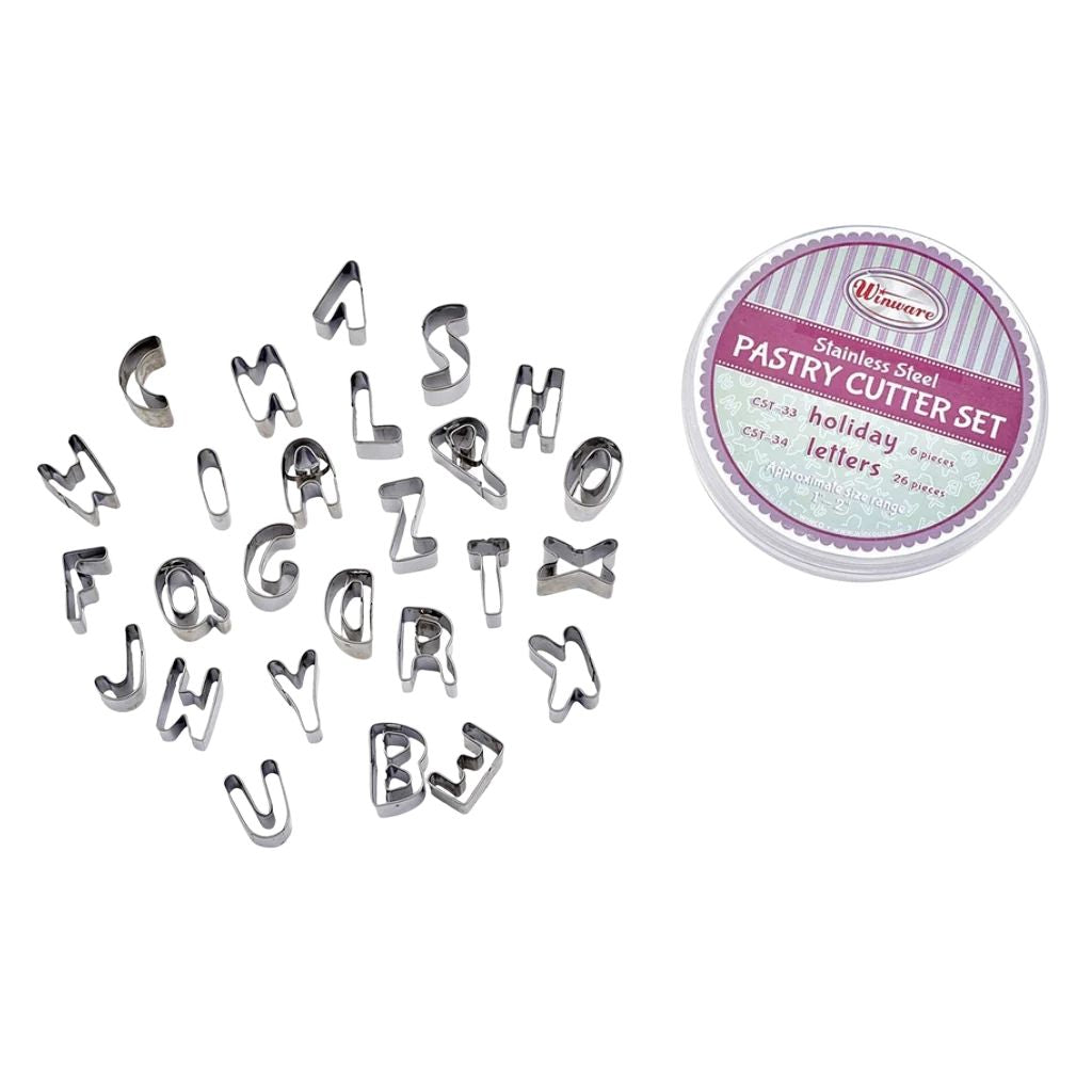 Material de construcción: Acero inoxidable.Color: Plata.Contiene 26 piezas diferentes.Cortadores en forma de letras.Rango de tamaños: 2.5 cm a 5 cm de largo.-Categoría: Utensi.Panad-Pastel
