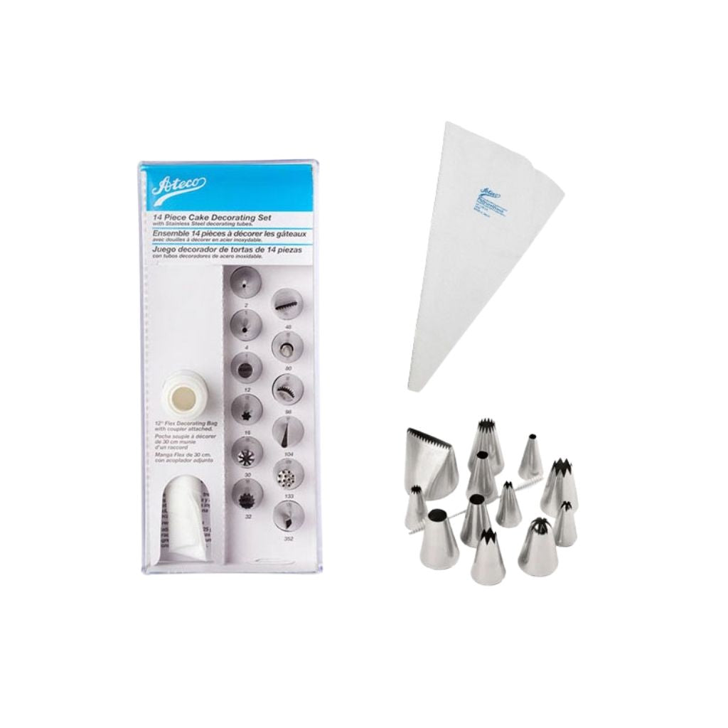 Este set contiene 12 boquillas, un adaptador y una manga pastelera.