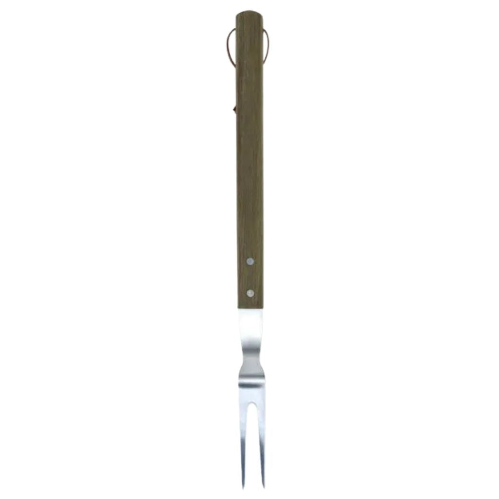- El tenedor tiene una construcción robusta, cuenta con mango de madera y una agarradera de cuero para colgar.
